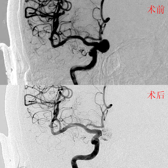 手术那天,医生先把微型弹簧圈填进鼓包,让血液不再流近动脉瘤,然后在主干血管里再“搭一道栅栏”(血流导向密网支架),让血流不再冲向鼓包,慢慢把它“晒干”。术后造影看,鼓包基本不再显影,主干血流通畅。