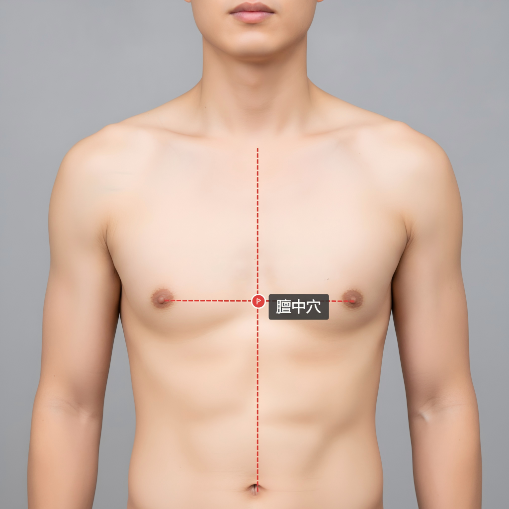 找准位置:端坐位或站立位,找到两乳头连线的中点,或者是连线与身体前正中线的交点,即为膻中穴。