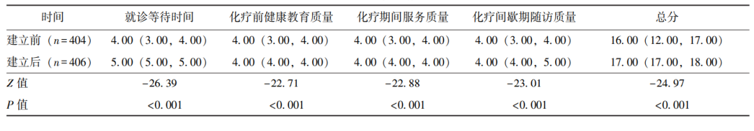 表1 模式建立前后化疗门诊患者满意度评分[M(P25, P75),分]