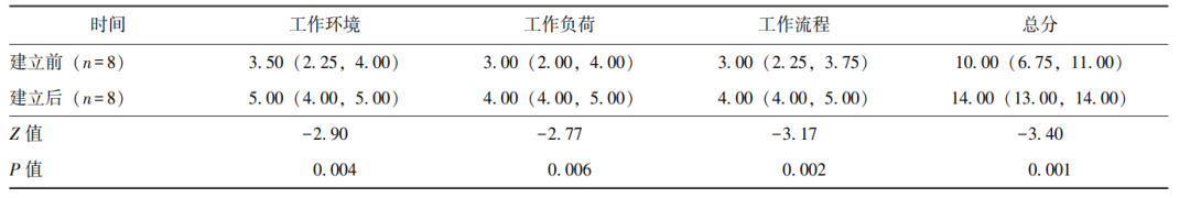 表2 模式建立前后化疗门诊医护满意度评分 [M(P25, P75),分]