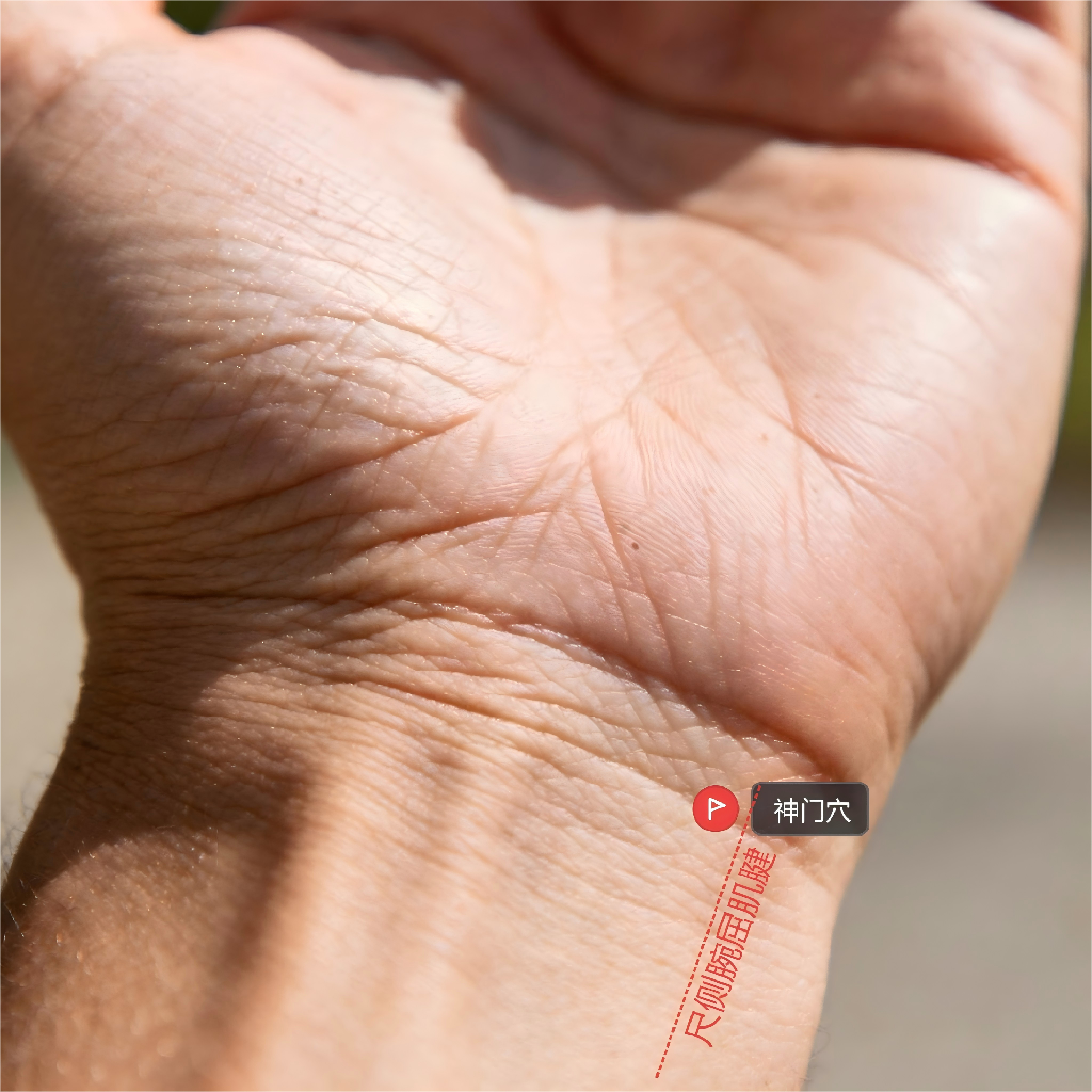 仔细观察手腕横纹,小指一侧靠近掌根的位置,有一个明显凹陷处,这里就是神门穴。