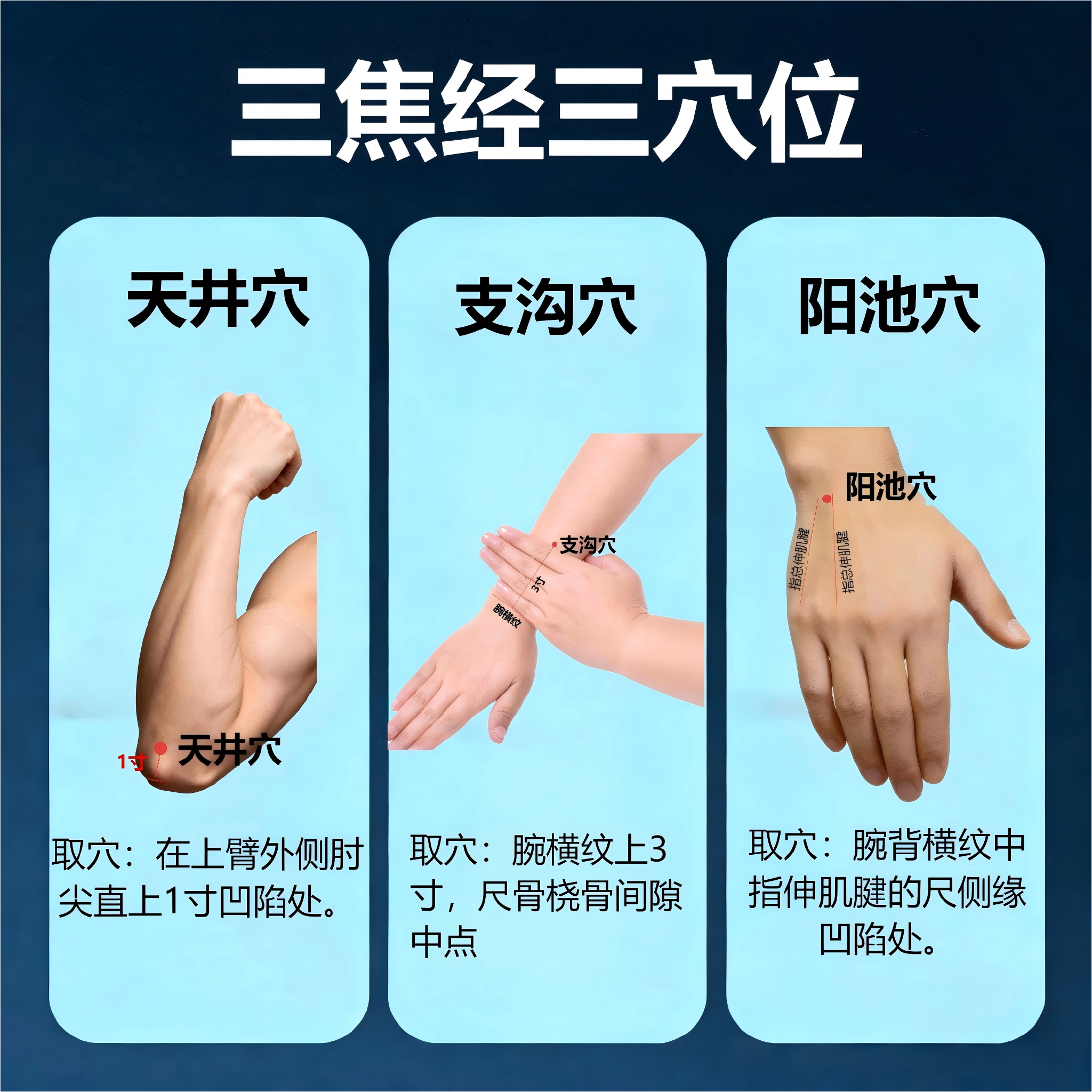 阳池穴(下焦):位于手腕背侧,能促进全身气机畅通,补一身之阳气。
