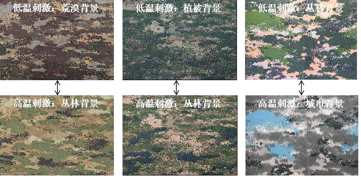 可见光伪装:采用双稳态温敏变色织物,可在丛林-荒漠、荒漠-城市、城市-岸滩等两两稳态切换,变色后色差≤5个△ELAB单位,人眼与光学侦察仪均难辨其与环境差异;