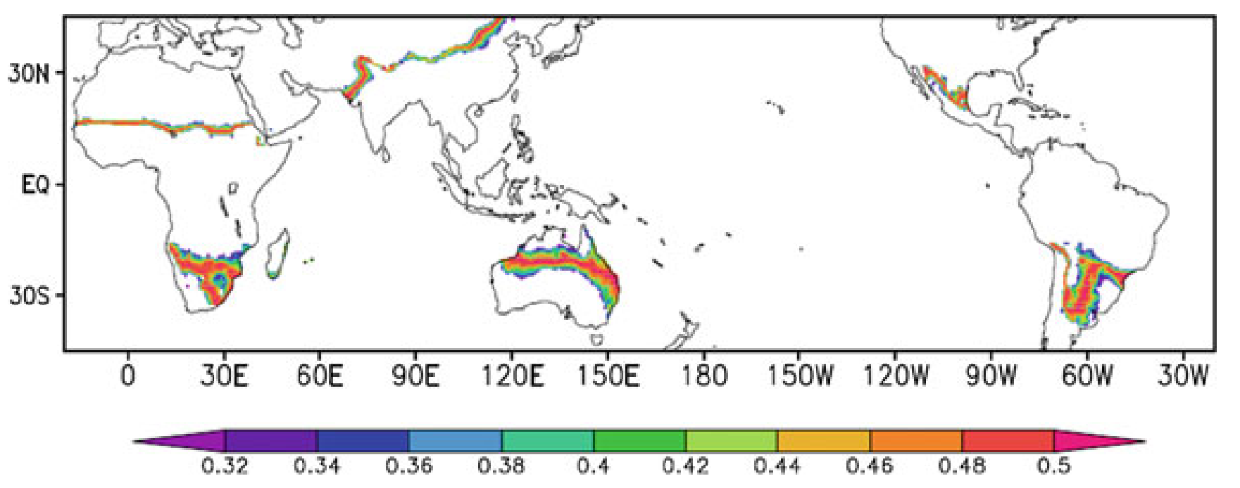 北京大学季风环境团队基于 1901-2008 年的全球陆地降水观测数据,绘制出了全球季风边缘活动带在陆地上的 “活动范围” [2]。从分布图中可清晰看出,这一活动带的 “空间性格” 在南北半球差异明显: