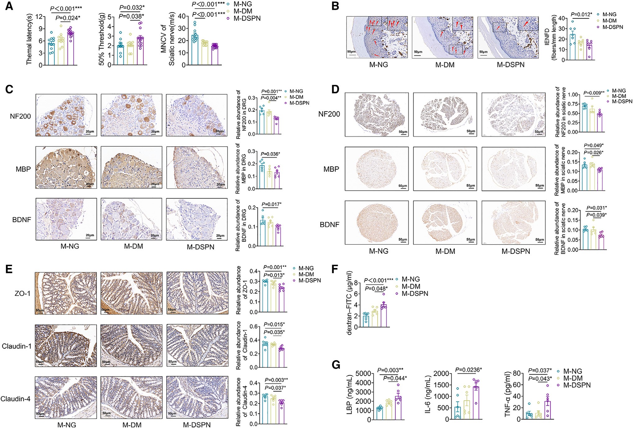 将糖尿病神经病变患者(DSPN)的粪菌移植给无菌小鼠,结果这些小鼠即使血糖正常,也出现了神经传导速度下降、神经纤维密度减少、疼痛感知减弱等典型神经病变表现;