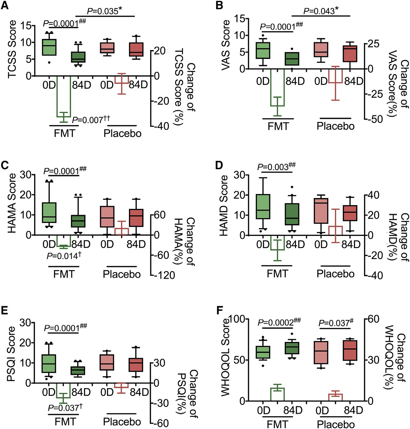图2. FMT缓解了DSPN患者的周围神经病变严重程度、焦虑和抑郁,并改善了睡眠和生活质量
