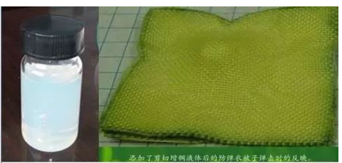 液体防弹材料具有环保性、无毒害、阻燃性、防爆性等特点,是一种新型智能纳米材料。其最突出的特点是,在一般情况下,该材料与普通液体无异,具有流动性和可变性,当遇到子弹、炮弹破片、刀剑等外力撞击时,会迅速变得无比坚硬,能有效抵御外来物的贯穿,起到缓冲减震、防弹、防刺、防贯穿的作用。