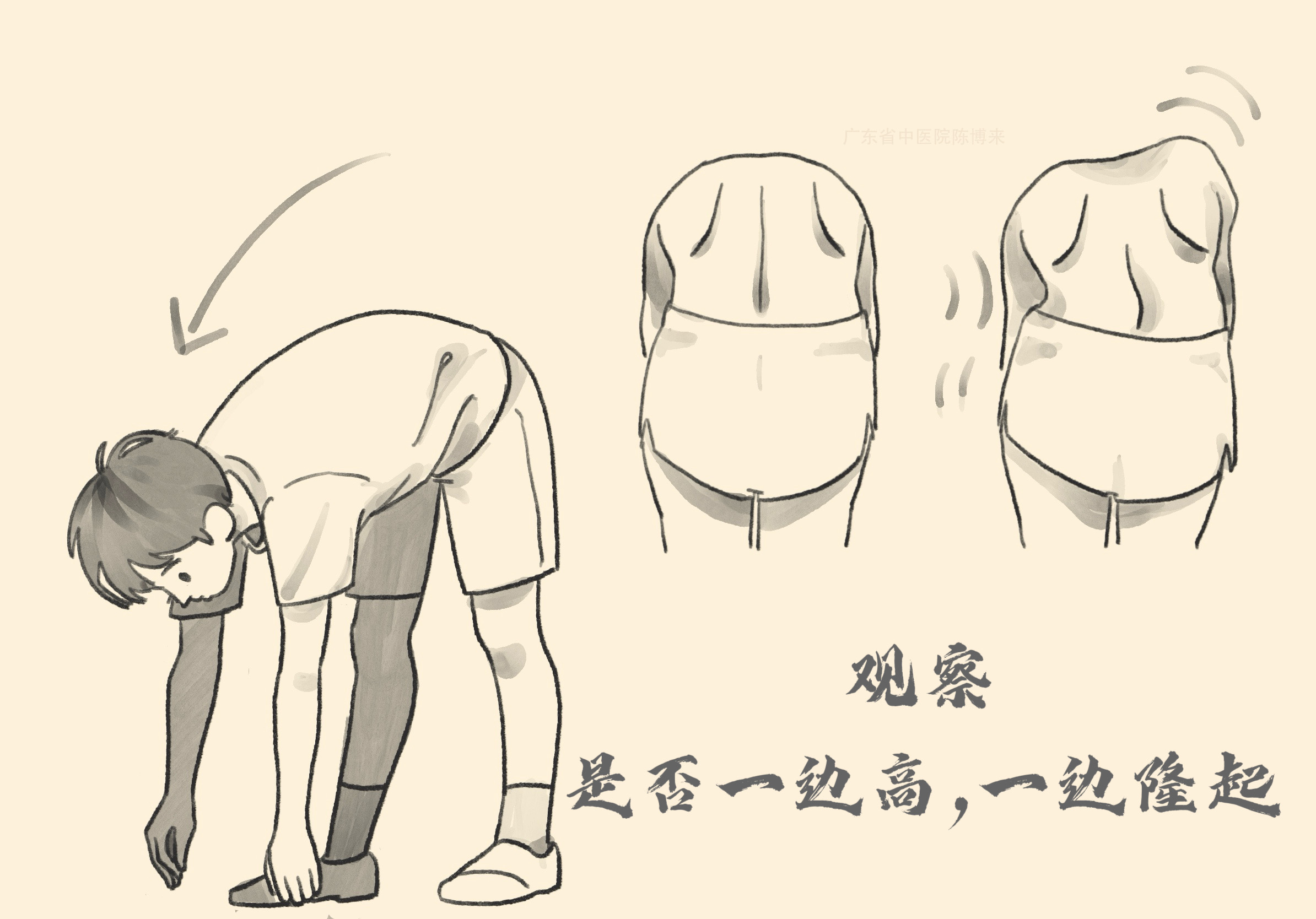 让孩子双脚并拢前弯90°,观察背部是否有隆起。