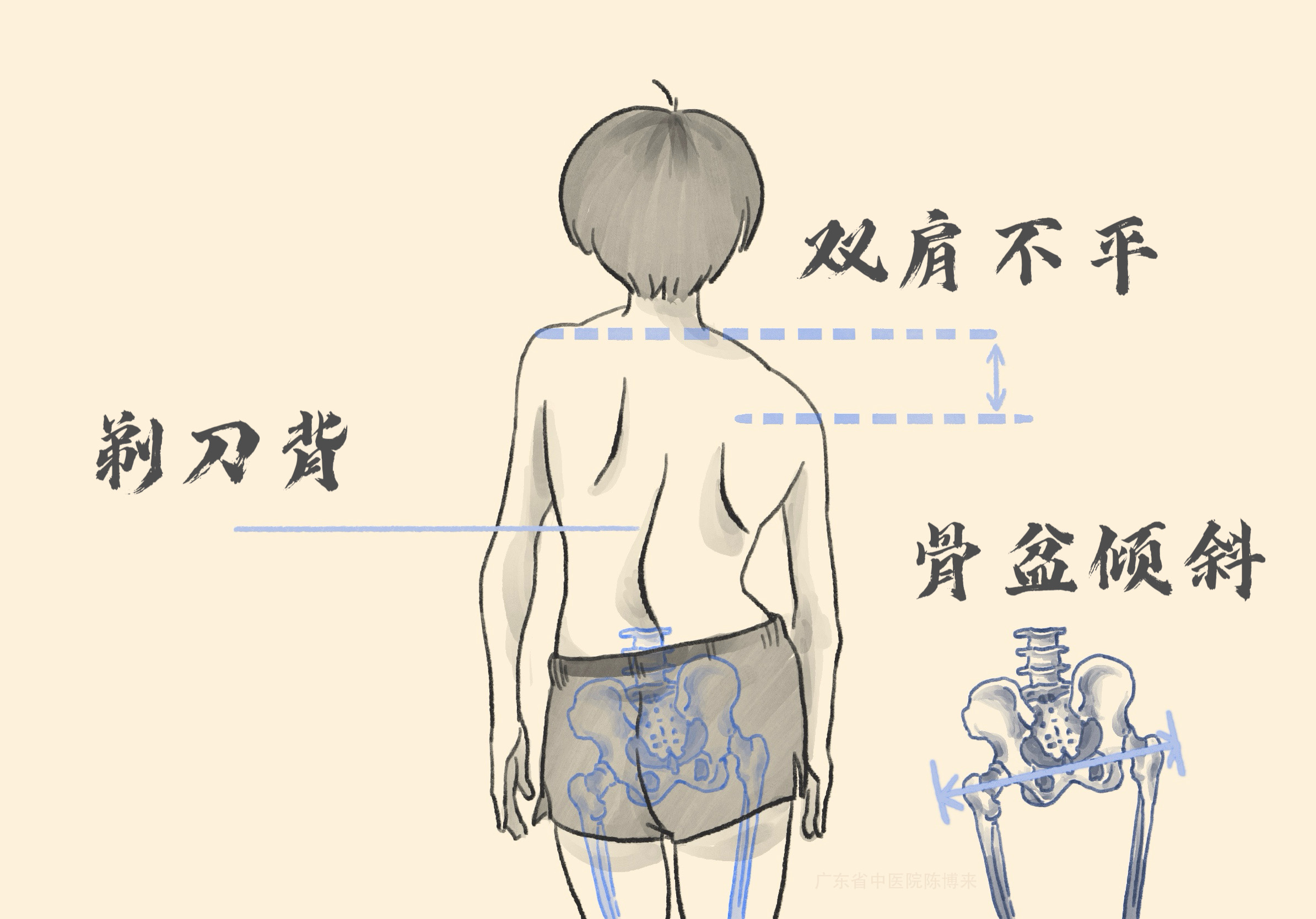 2.背部不对称:弯腰时,一侧背部隆起(“剃刀背”现象)。