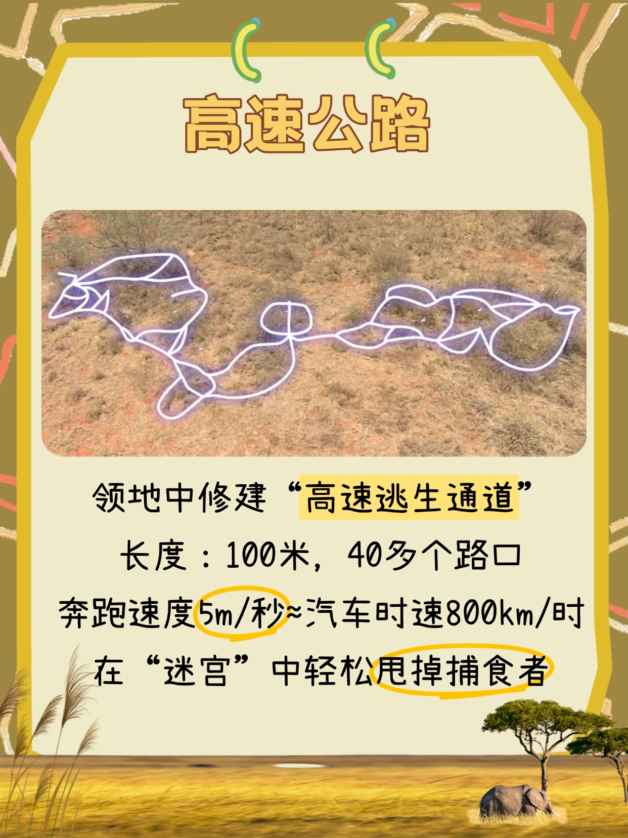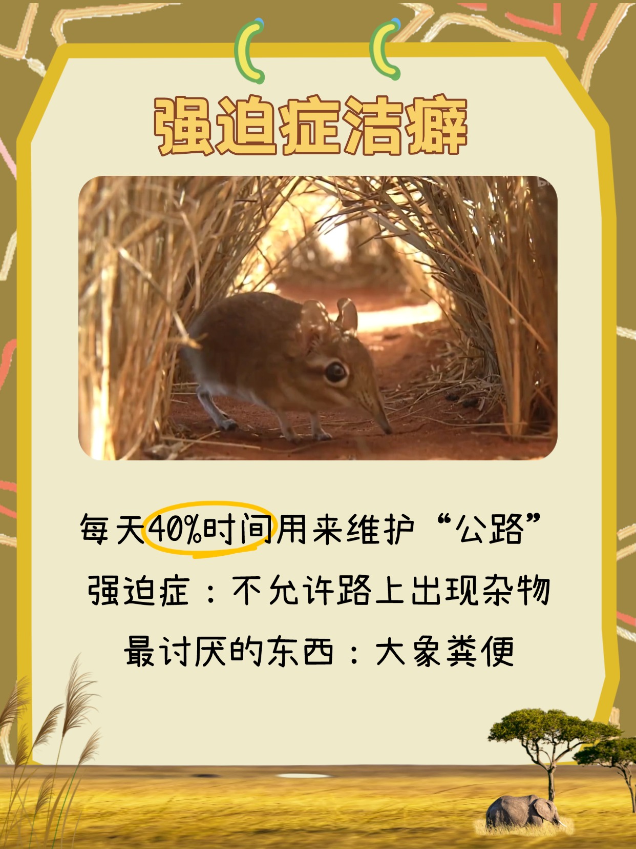 成年象鼩除晚上睡觉外,40%时间在修路。它们在矮树丛开小路作逃命通道,然后像赛车手一样高速“漂移”,熟悉并清理路面,防止小障碍物在躲避天敌时堵塞“交通”危及生命,生存智慧满分