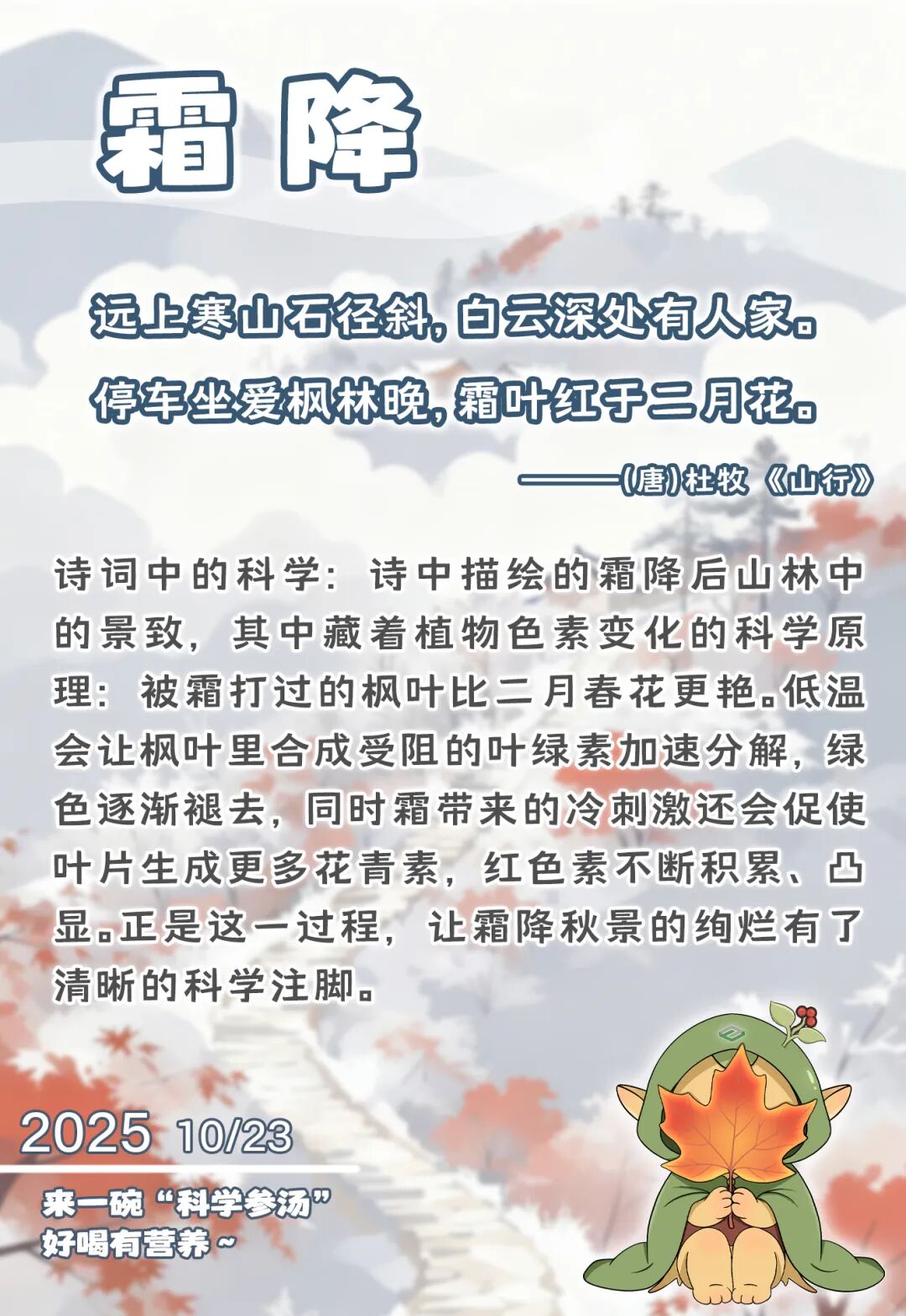 霜降后的枫叶红得热烈,是因为它接纳了季节的变化。若能坦然接纳途中的风霜,不怨天尤人,不望而却步,这份经历反而会淬炼出坚韧的心性与清明的眼光,助我们在困境中寻得转机与新的可能。恰如枫叶,若非经历低温的洗礼,又怎能将生命积淀的能量,燃烧成这般温暖而明亮的红色?