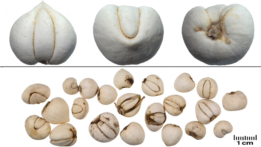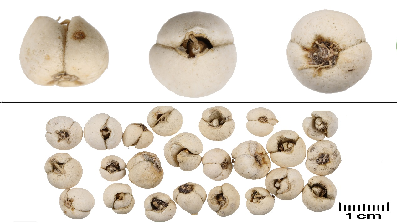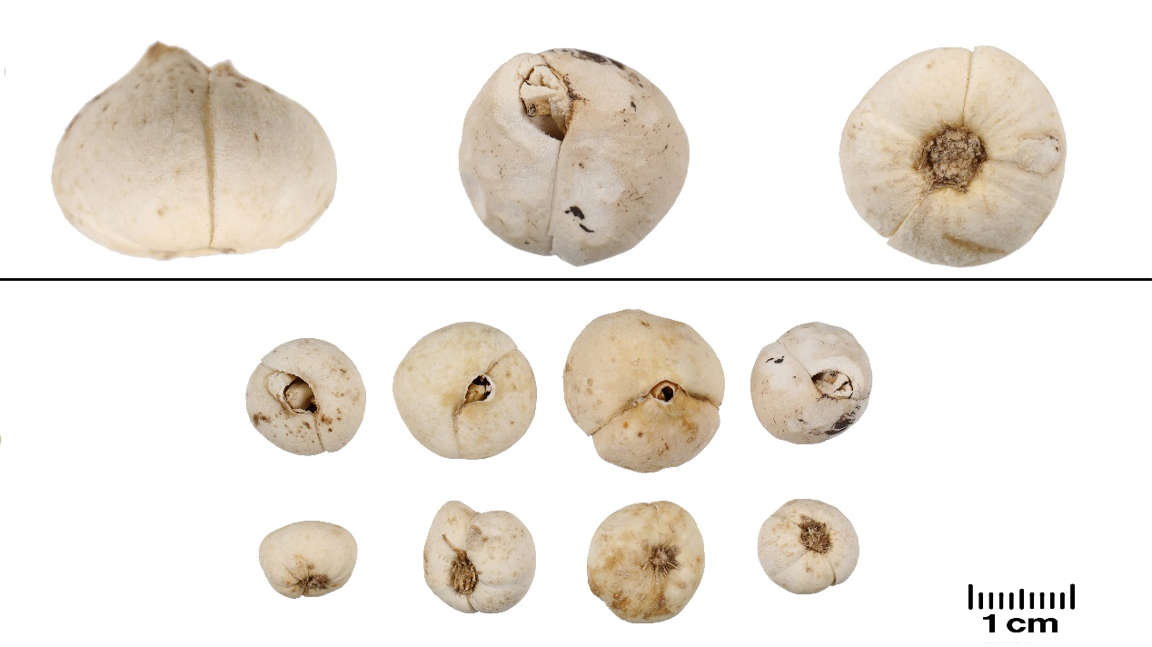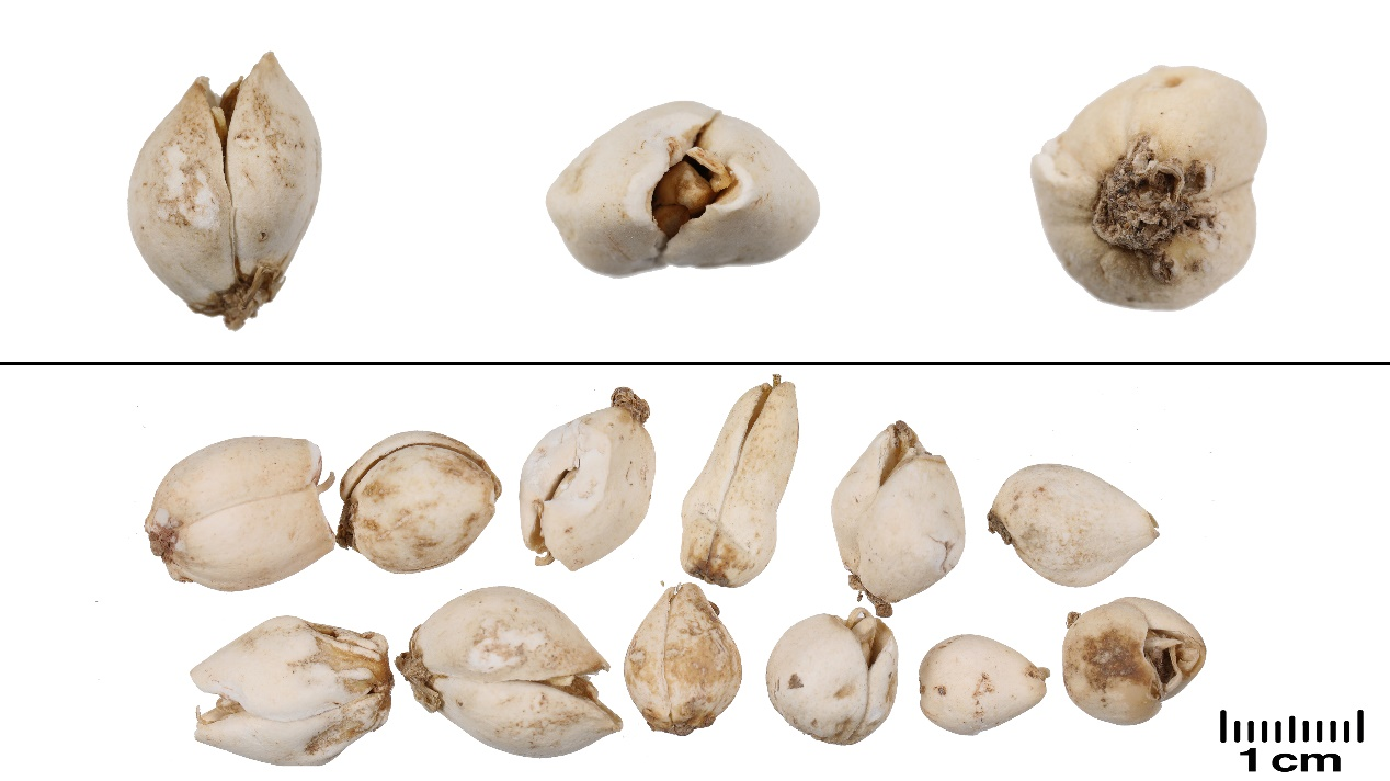 青贝 呈类扁球形,高0.4~1.4cm,直径0.4~1.6cm。外层鳞叶2,大小相近。相对抱合,顶端开裂,内有心芽和小鳞叶2~3枚及细圆柱形的残茎。质地较松贝略疏松,断面粉白。