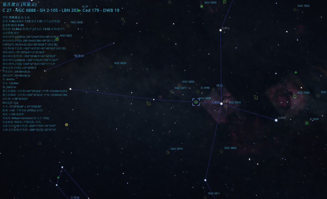 眉月星云在天鹅座中的位置。图像来源:Stellarium