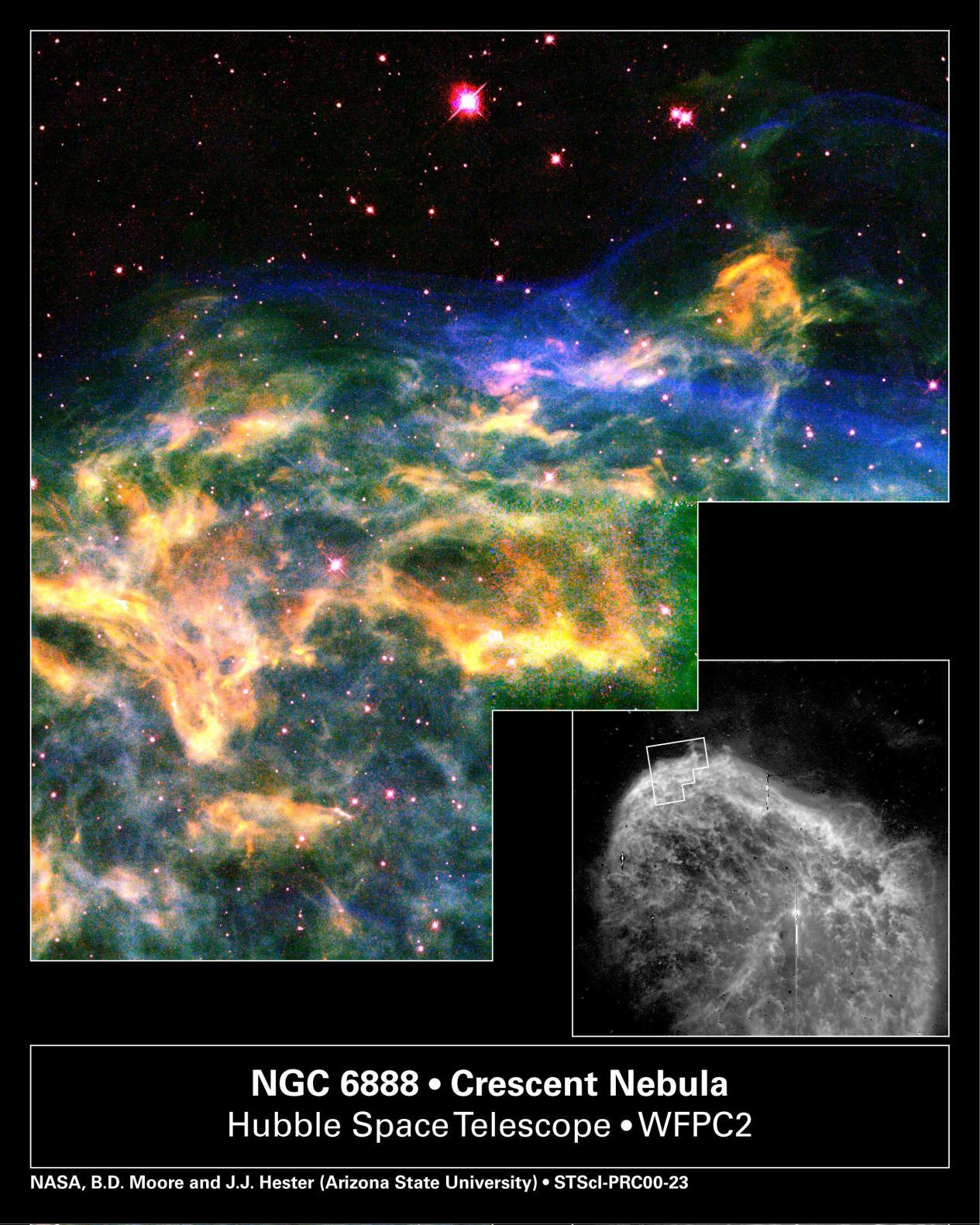 WR 136又名HD 192163,位于眉月星云的中心。它的亮度为7.5星等,质量是太阳的21倍,半径是太阳的5.1倍,表面温度高达7万度。大约20万年前,WR 136演变为红超巨星的时候,抛射出了许多外层物质。现在这些物质以大约80千米/秒的速度膨胀,而它的星风的速度大约是1700千米/秒。快速的星风与此前抛射的物质壳层相撞,将其压缩、加热,塑造出了我们看到的纤细而复杂的弧状结构。同时,WR 136辐射出强烈的紫外线,使物质壳层激发并发光,形成了眉月星云。拥有类似成因的还有气泡星云(NGC 7635)和雷神头盔星云(NGC 2359)等。