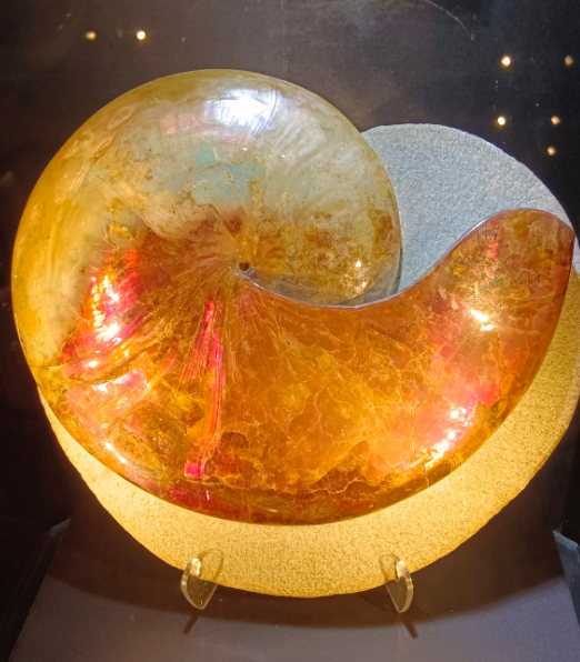 斑彩螺又名斑彩石或者斑彩菊石。其实最后这个名字透露了它真实的身份,它并不是蜗牛或者螺,而是已经灭绝的一种头足动物——菊石。菊石其实是几千万年前的海洋中的“老玩家”了,也是大家口中美味的“铁板鱿鱼”或者“章鱼小丸子”的上一代老祖。这些海洋中的“老前辈”们曾经在中生代与恐龙们一起繁盛,但是在白垩纪末期又和非鸟恐龙们一起被“注销账号”了。