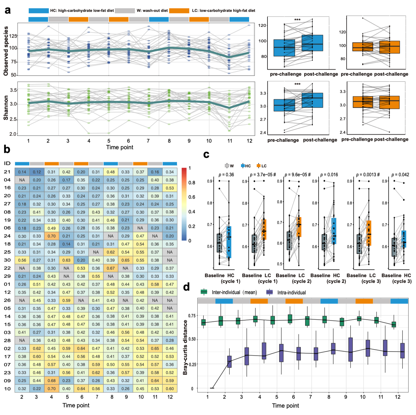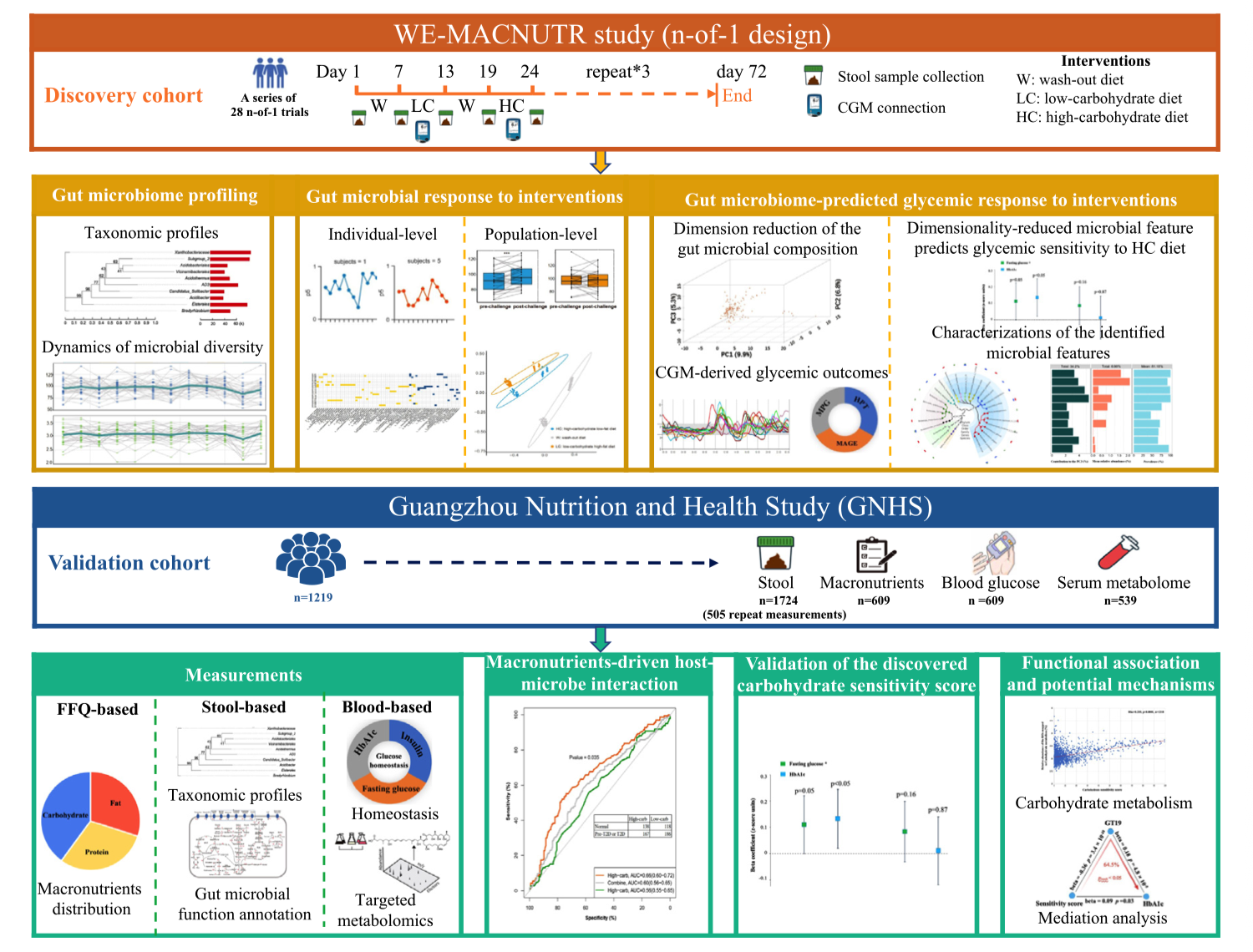 即每个人都在自己身上进行交叉对照,轮流摄入不同类型的膳食(高脂、高碳、高纤维等),同时配戴 连续血糖监测仪(CGM),并每日采集粪便样本进行宏基因组测序。