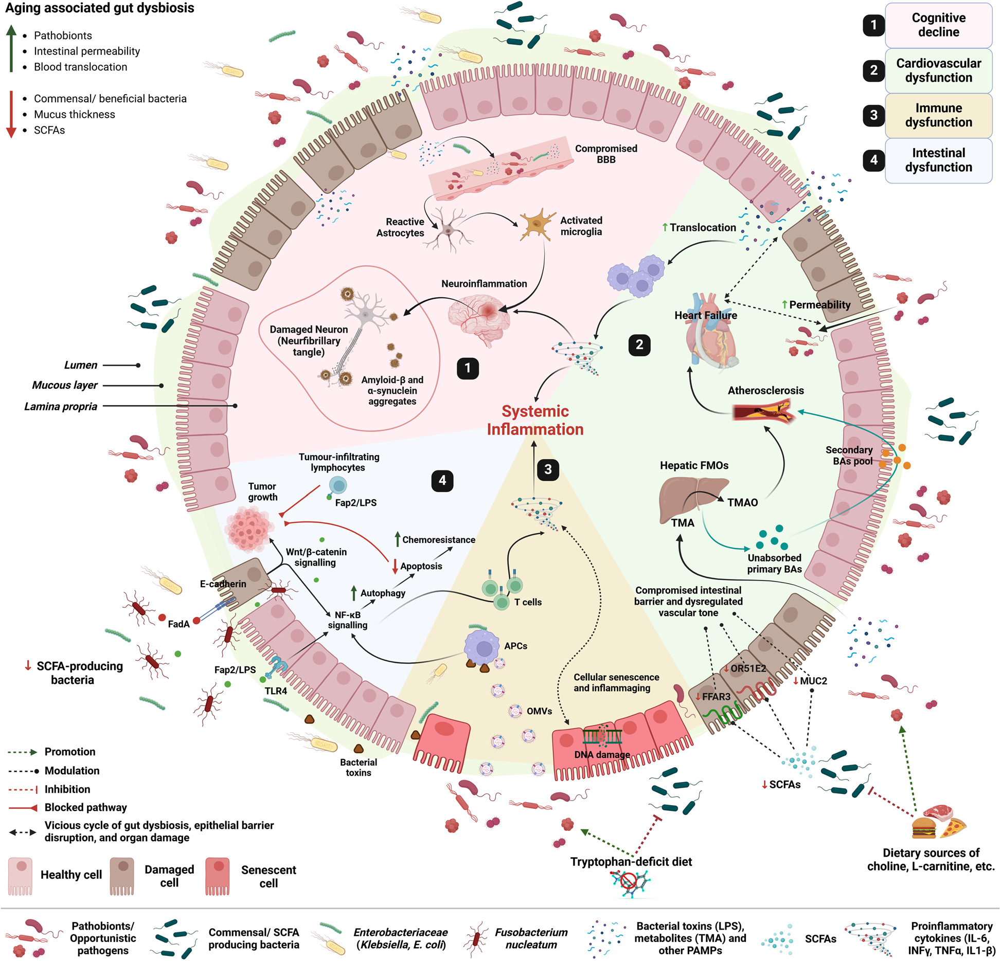 图2:论文中的系统性机制图。展示从肠漏、免疫激活到心血管、神经、骨骼肌等多系统老化的级联路径。