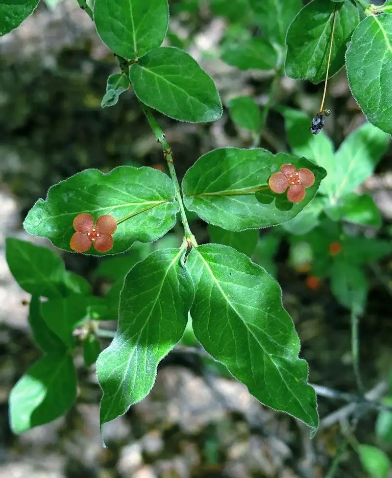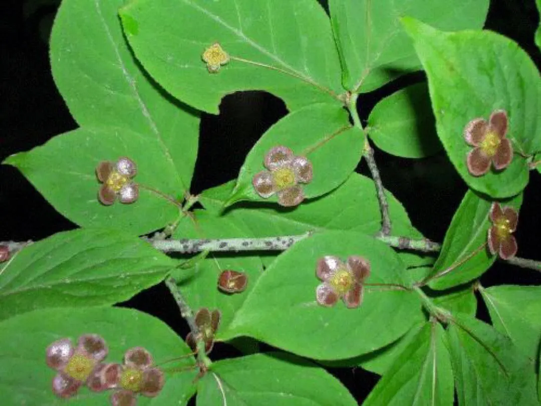 瘤枝卫矛通常呈聚伞花序,常见一至三朵花,偶尔可达四至五朵。花序梗细长。花朵并非生于树枝顶端,而是从叶片与枝条的交界处,伸出一根细长的花梗,花朵恰好在叶片上方绽放,花瓣轻薄如纱,边缘微微卷起,簇拥在叶片中央。在阳光照射下,瘤枝卫矛的叶片泛着光泽,小巧玲珑的红棕色花朵,远观如同悬挂在叶面上的小水晶吊坠,晶莹剔透、轻盈可爱,在光影交错中闪烁生辉,折射出璀璨光芒。萼片边缘有绒毛,花瓣近乎圆形。花盘扁平圆形,雄蕊着生在花盘近边缘处,没有花丝。子房大部分位于花盘内,柱头较小。花蕊如同一颗颗金色的小珍珠,镶嵌在花的中央,在阳光的照耀下,散发着柔和而迷人的色彩。