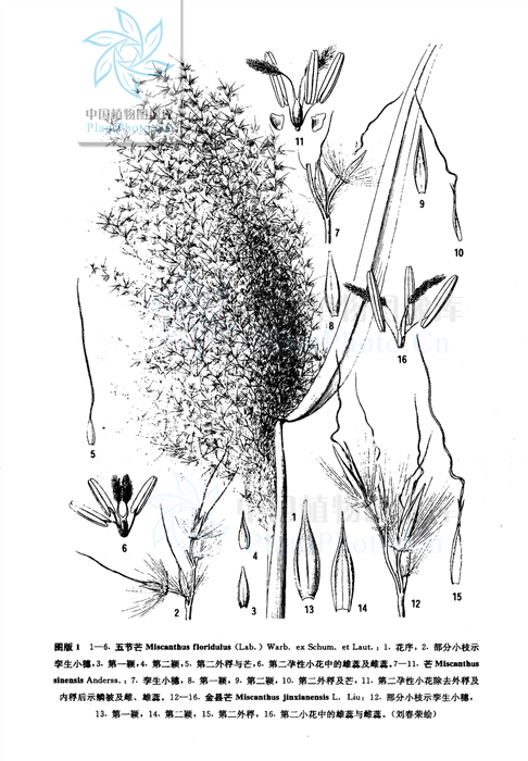 荻:多年生,具发达被鳞片的长匍匐根状茎,节处生有粗根与幼芽。秆直立,高1-1.5米,直径约5毫米,具10多节。芒:多年生苇状草本。秆高1-2米,无毛或在花序以下疏生柔毛。