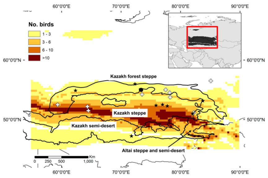 同位素追踪揭示的细嘴杓鹬潜在繁殖地,生态区域从北到南依次为哈萨克森林-干草原(Kazakh forest steppe),哈萨克干草原(Kazakh steppe),哈萨克半荒漠(Kazakh semi-desert),阿尔泰干草原-半荒漠(Altai steppe and semi-desert),星号代表5-7月间的目击记录,白色十字代表同时期的标本记录,黑色点即瓦连京发现的繁殖地,引自Buchanan et al. 2018