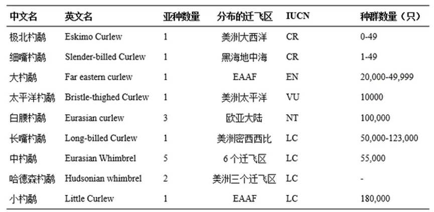 9种杓鹬的IUCN红色名录受胁等级,及种群估值(2021年以前):(IUCN等级:EN-濒危、VU-易危、NT-近危、LC-无危)
