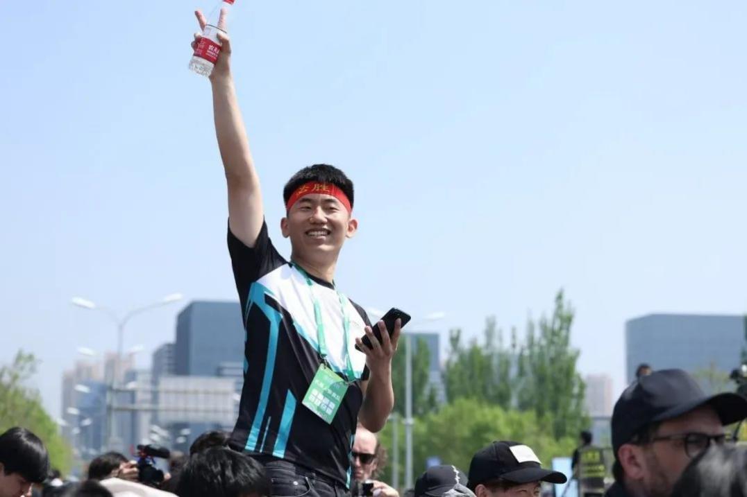 戴着“必胜”红色发带,27岁的姜哲源在人形机器人半程马拉松赛场边激动地挥舞双臂,为自家机器人N2加油助威,还不忘激情劝说旁边观众“买一台玩玩”。