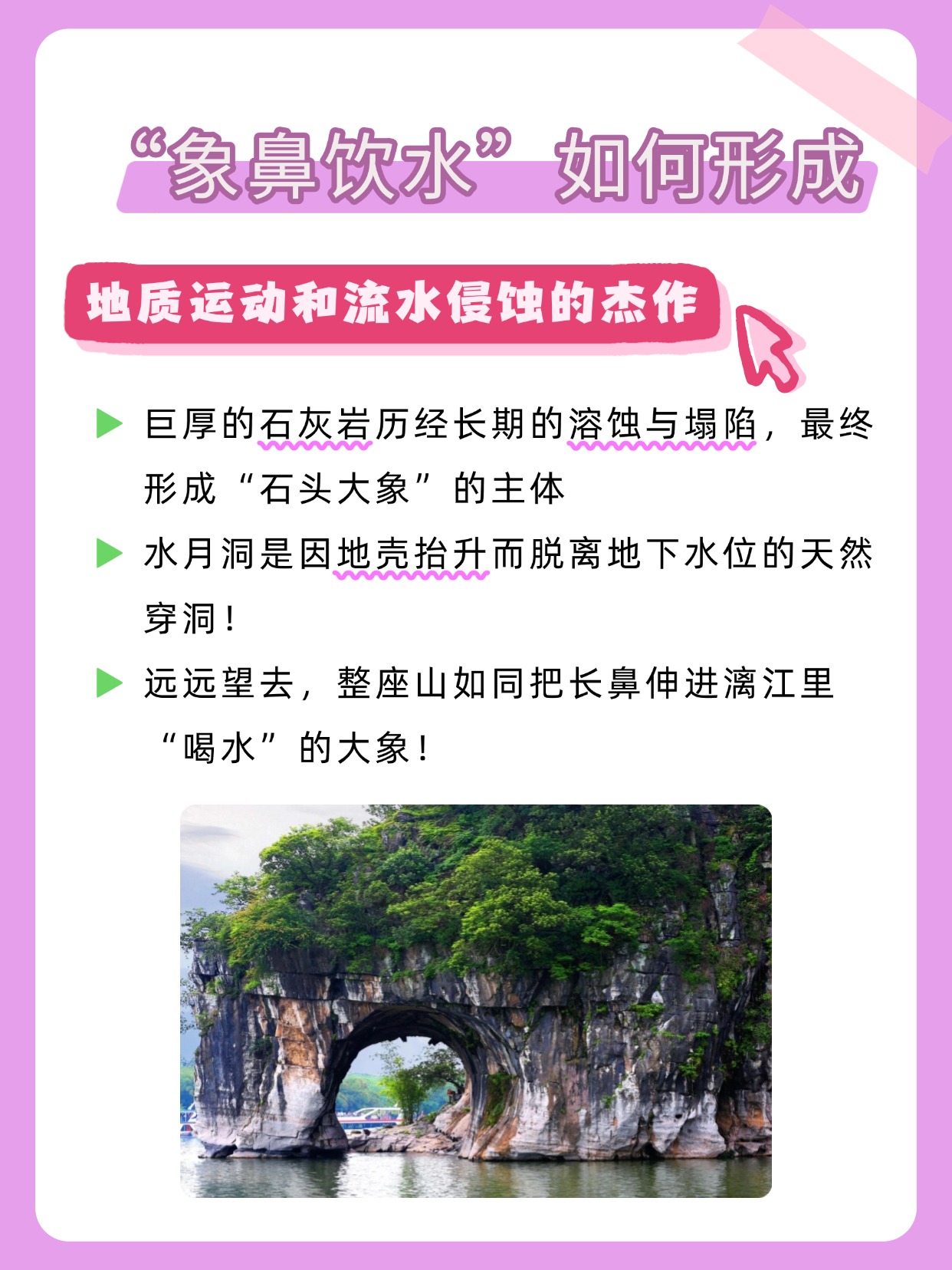象鼻山由巨厚的石灰岩组成,历经长期的溶蚀与塌陷,最终形成“石头大象”的主体。