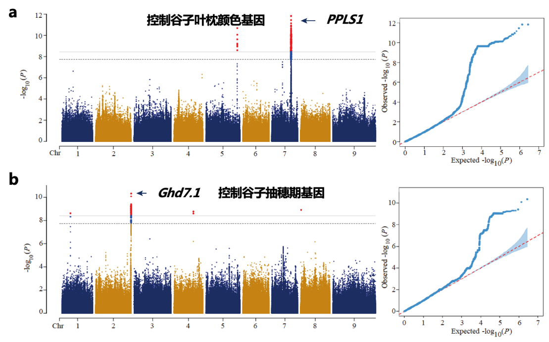 研究人员构建的微核心种质保留了原始种质资源的遗传多样性,既减少了冗余,又避免了重要基因的流失。同时,可以极大提升种质资源和基因资源的挖掘利用效率。利用该“精英群体”,科学家们进一步开展了全基因组关联分析,成功鉴定到10个与农艺性状相关的遗传区域,也就是影响抽穗时间、颜色等性状的关键基因片段。其中PPLS1基因与谷子叶枕颜色相关,而Ghd7.1基因是控制抽穗期的关键基因。这些发现不仅有助于理解谷子的遗传机制,也为培育高产、优质、适应性强的新品种提供了重要依据。