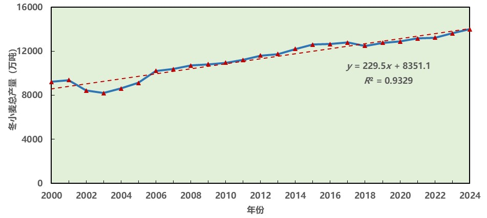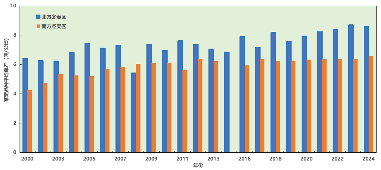 粮食安全是“国之大者”,关乎我国14亿多人口的生存需求,也是应对国际风险的战略屏障。小麦是我国三大主粮作物之一,其中冬小麦产量约占全国小麦总产的95%。随着育种、栽培等农业科技的进步,冬小麦的产量在稳步提升(图1),品质持续得到优化,口粮自给率基本达到100%,不仅满足了我国人民对高端优质面包、糕点等的需求,也显著改善了馒头、面条等多样化中式食品的加工品质。优良品种种子自主率已达到100%,“中国粮主要用中国种”有了基础,为口粮绝对安全提供了坚实保障。那么,冬小麦是如何让“国家粮仓”更殷实的呢?本文将从2000年至今我国各区域通过国家审定品种产量和品质性状演变的角度,讲述冬小麦近20多年来的高产优质发展之路。