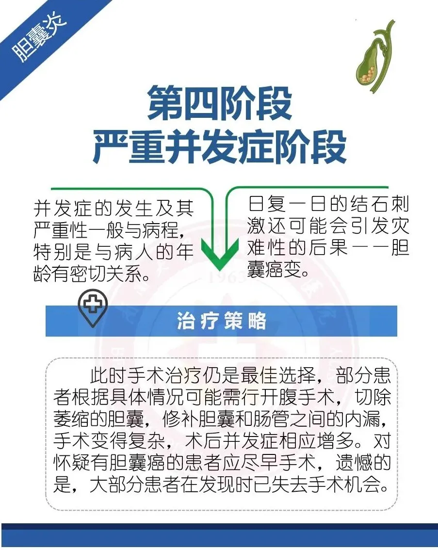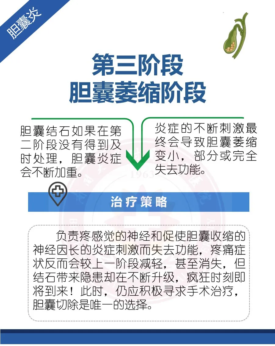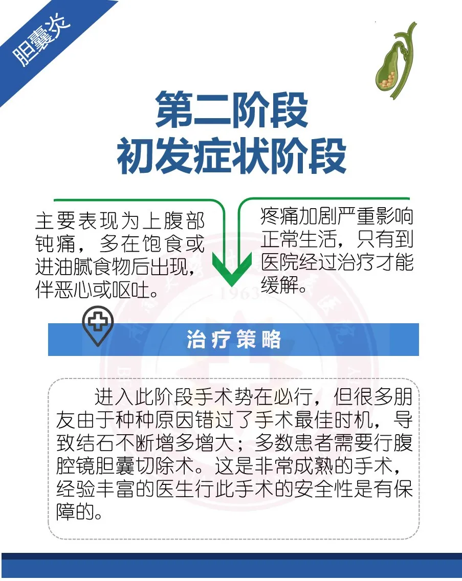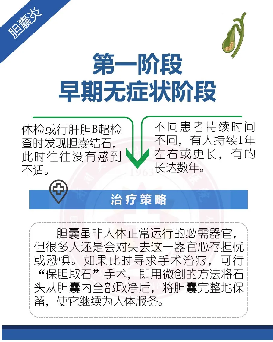 胆囊结石是胆石症中最为常见的一种,根据病情发展的阶段不同,所表现出的临床症状和治疗策略也不同: