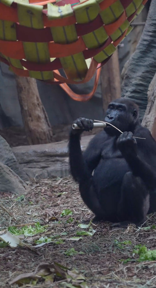 每天9:00前,四兄弟在非展示区吃早餐,这样安排主要是对 “野菜天团” 的多重呵护:一方面,清晨是他们自然进食的黄金时段,早餐中的胡萝卜、茄子、洋葱等食材,是他们喜欢吃的食物,舒适、专注的进食节奏,可以很好的避免群体冲突;另一方面,喂食过程也是饲养员开展 “健康监测” 的关键环节 —— 需要细致观察每只猩猩的进食量、咀嚼状态,初步判断四只大猩猩的健康状况。