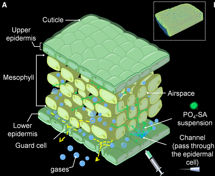 经过大量实验,他们选择了名为 SrAl₂O₄:Eu²⁺,Dy³⁺ (一种以Eu²⁺、Dy³⁺等离子激活的碱土铝酸盐系磷光材料)的绿色长余辉材料。研究发现,这种颗粒如果被处理得足够细、足够稳定,就能安全地进入植物叶片的组织间隙中。关键在于,他们不是让颗粒进入细胞,而是沿着细胞与细胞之间的空隙扩散,就像微小的光粒子在植物体内均匀分布。