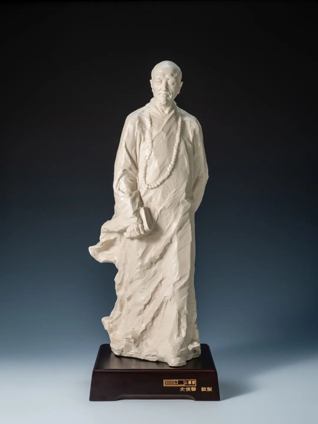 《弘一法师》是由史俊贤于2019年3月创作的陶瓷作品尺寸为高48cm,宽18厘米,厚16厘米。现藏于中国工艺美术大师博物馆。以德化瓷土为原料。作品表现了晚年时的弘一法师,“无心者公,无我者明”的挺健洒脱、安祥超逸、智慧通达、宁静淡雅的形象。采用具象刻画面部表情,表达弘一法师心怀苍生,慈悲为怀之神韵,在衣服上的处理简洁却不简单的几笔,刚柔并济,粗中有细。整件作品充分展现其“以儒济世、以道修身、以佛治心”的人生修为,以及的人物独特的--“涵容以待人,恬淡以处世”之一代宗师的神韵及风范。