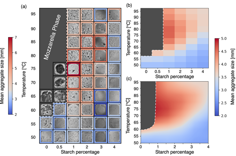这张图的横轴是淀粉浓度百分比,纵轴是温度。每个点代表一个样品,颜色代表奶酪团块的大小。