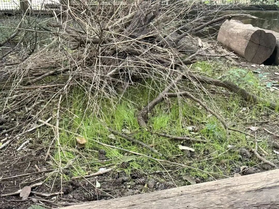 饲养员早早就行动了,给外场添上了垫料,如应季收集的落叶、松针,都被铺成厚厚的一层,覆盖在动物常走的路径上,让他们踩上去能有柔软厚实的脚感。