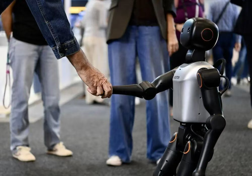 9月25日,一名观众在德国柏林国际消费电子展上与人形机器人握手。(新华社记者 张豪夫 摄)