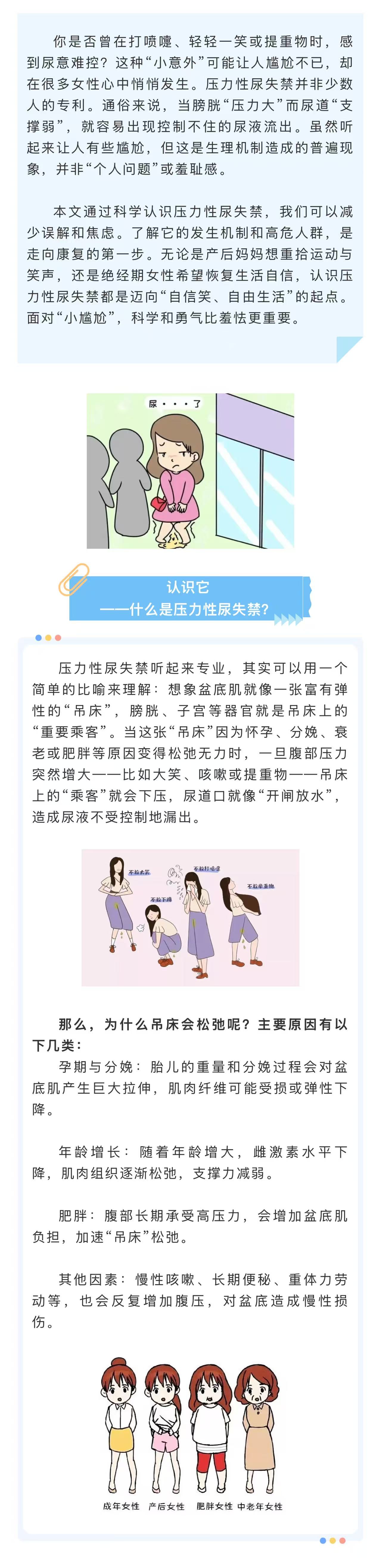 图文简介: 本文通过科学认识压力性尿失禁,我们可以减少误解和焦虑。了解它的发生机制和高危人群,是走向康复的第一步。无论是产后妈妈想重拾运动与笑声,还是绝经期女性希望恢复生活自信,迈向“自信笑、自由生活”。
