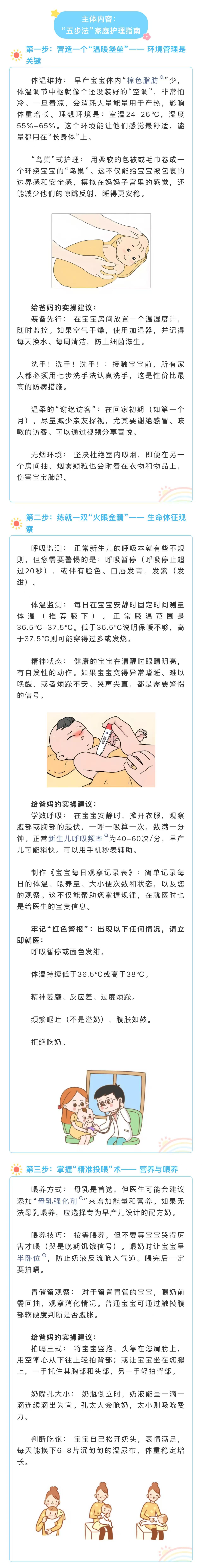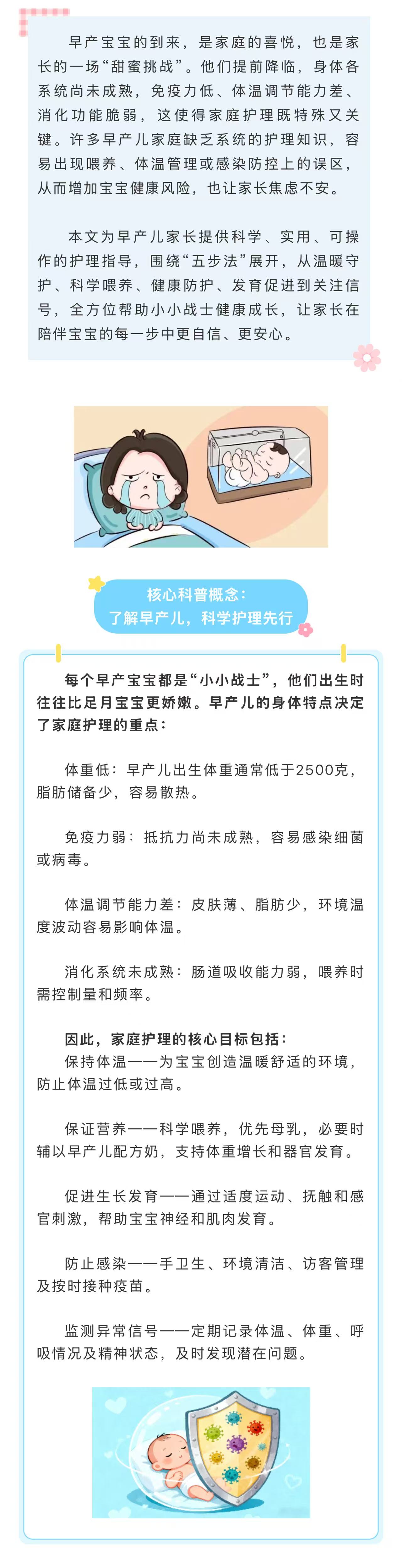 图文简介: 本文为早产儿家长提供科学、实用、可操作的护理指导,围绕“五步法”展开,从温暖守护、科学喂养、健康防护、发育促进到关注信号,全方位帮助小小战士健康成长,让家长在陪伴宝宝的每一步中更自信、更安心。