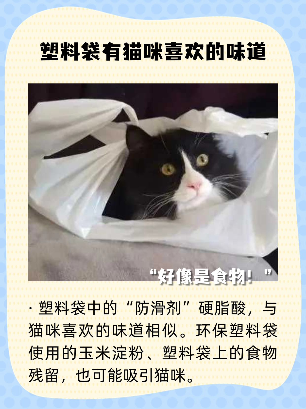 •塑料袋中含有“防滑剂”——从动物脂肪中提取的硬脂酸,与猫咪喜欢的味道相似。