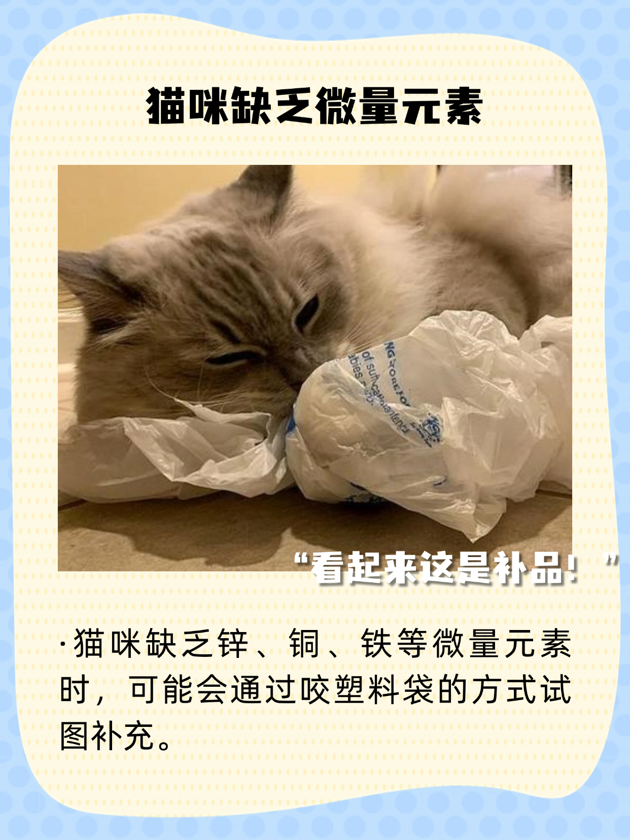 •猫咪缺乏锌、铜、铁等微量元素时,可能会通过咬塑料袋的方式试图补充!