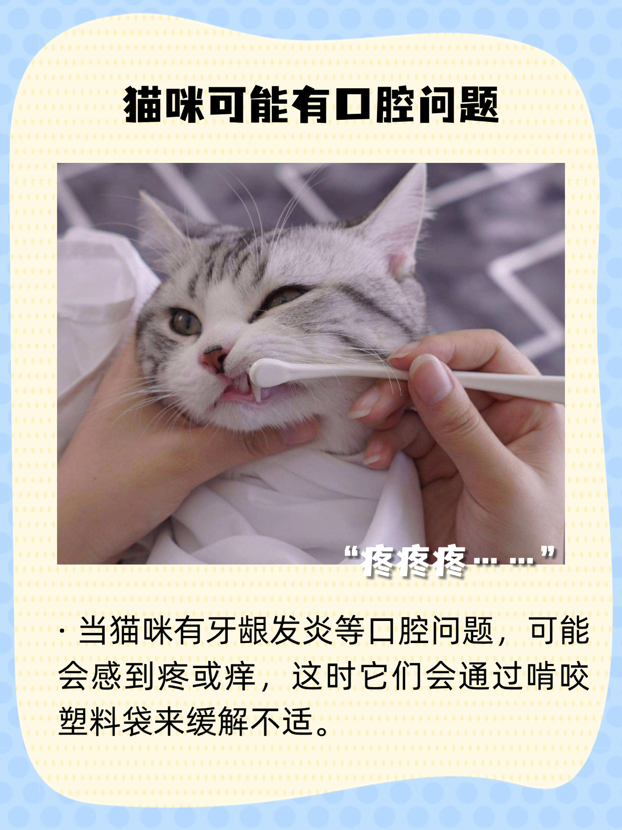 •如果猫咪感到牙疼或者有牙龈发炎等口腔问题,可能通过咬塑料袋的方式来缓解。