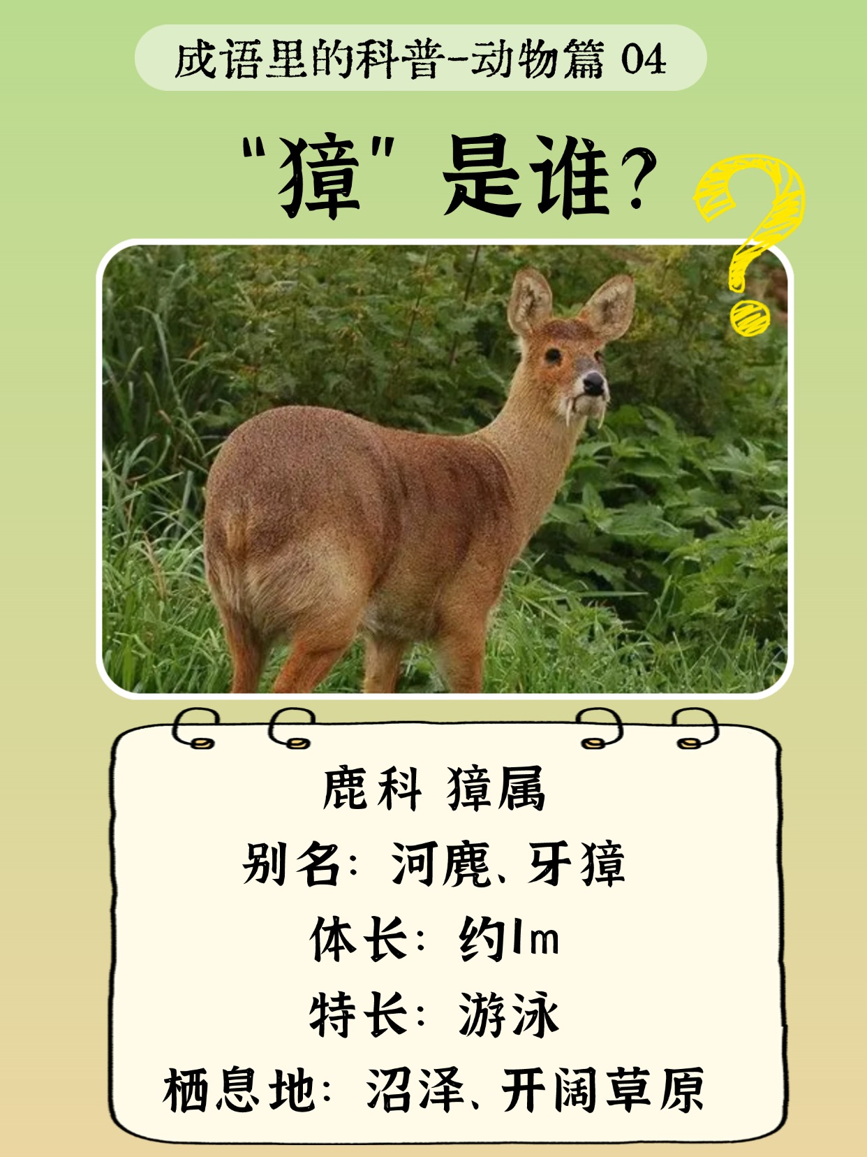 🏞️栖息地:獐爱水边,芦苇丛是它们的秘密基地,游泳技能满分,逃跑时嗖嗖的!