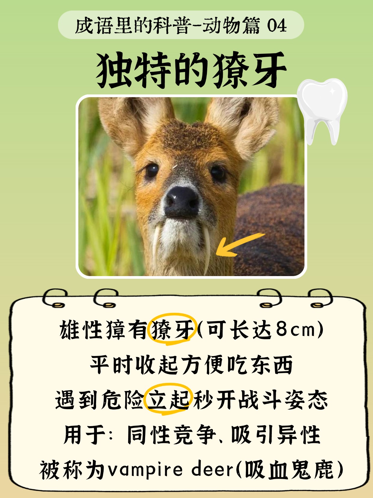 👀特征:四肢细小却发达,耳朵大而灵敏,尾巴短到几乎看不见,最抢眼的是雄獐那对5~10厘米的獠牙,像不像小吸血鬼?🧛♂️