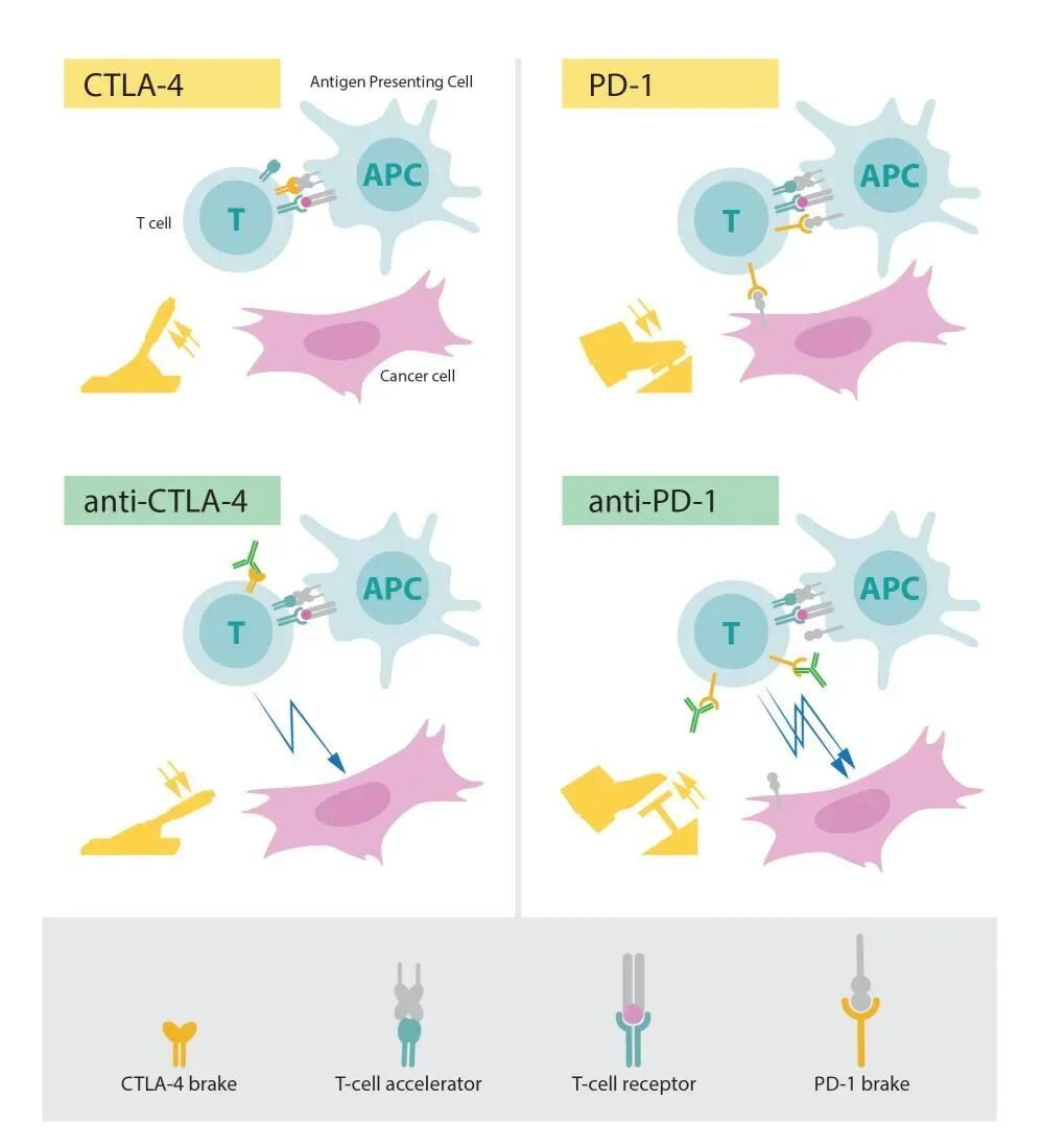 图1 两种经典免疫检查点——CTLA-4和PD-1——以及它们各自的抑制剂(即免疫检查点抑制剂,ICI)如何帮助T细胞重新激活、攻击肿瘤细胞。© The Nobel Committee for Physiology or Medicine.Illustrator: Mattias Karlén | 图源:nobelprize.org
