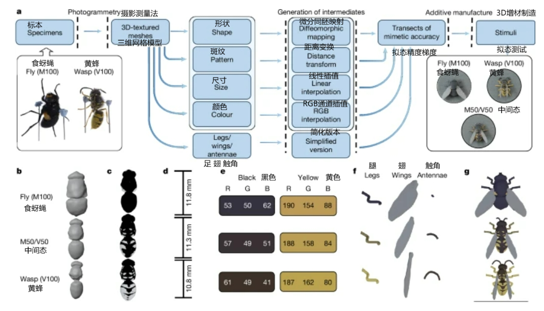 3D 打印模型未复制蜂的气味、触觉、行为,仅还原可见视觉特征——这种设计能排除非视觉变量的干扰,精确量化颜色、形状等每项视觉特征的“保护力”,评估 “自然界不存在的表型” 的生存优势,进而验证一些猜想: