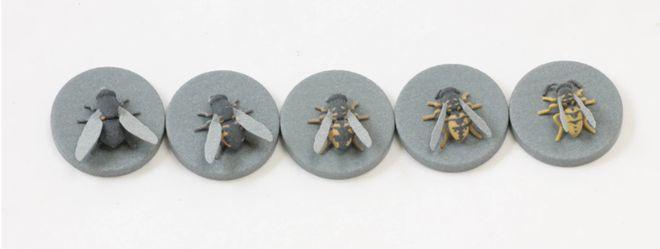 一组3D打印仿生昆虫模型,包括一只苍蝇(左)、一只黄蜂(右)和三只通过3D变形技术产生不同程度模仿的中间体