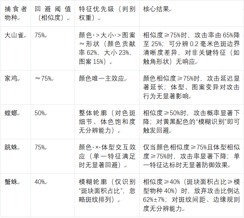 在多捕食者共存体系中,拟态者只需满足对应捕食者最敏感的核心判别标准,即可在成本-收益权衡下维持“够用”而非“最大化”的防御水平。