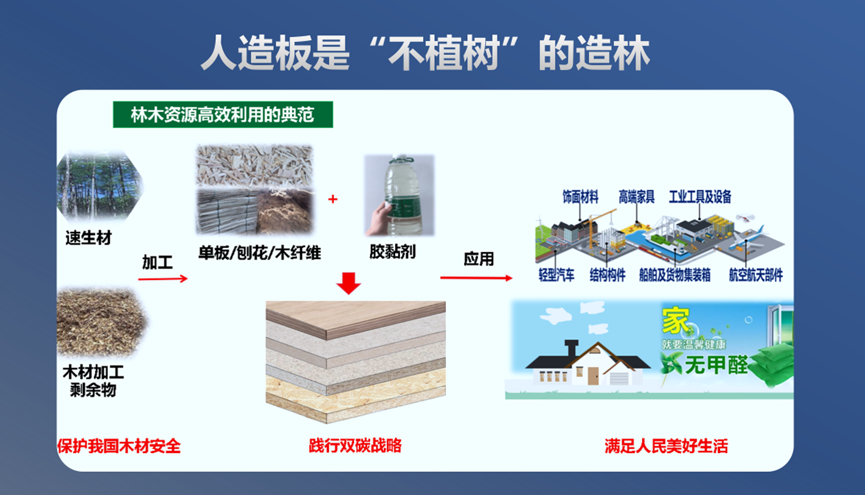 人造板以速生材或木材加工剩余物为原料,经胶黏剂粘接而成,可以说是变废为宝的典范。它让有限的林木资源得到高效循环利用,被称为“不植树”的造林。