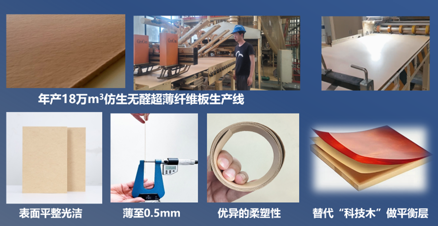 我们建成了全球首条年产18万立方米的仿生超薄纤维板生产线,产品厚度仅0.5毫米,是目前全球最薄的无醛纤维板。该产品兼具防水、抗菌、抗病毒性能,已实现规模化生产和出口。