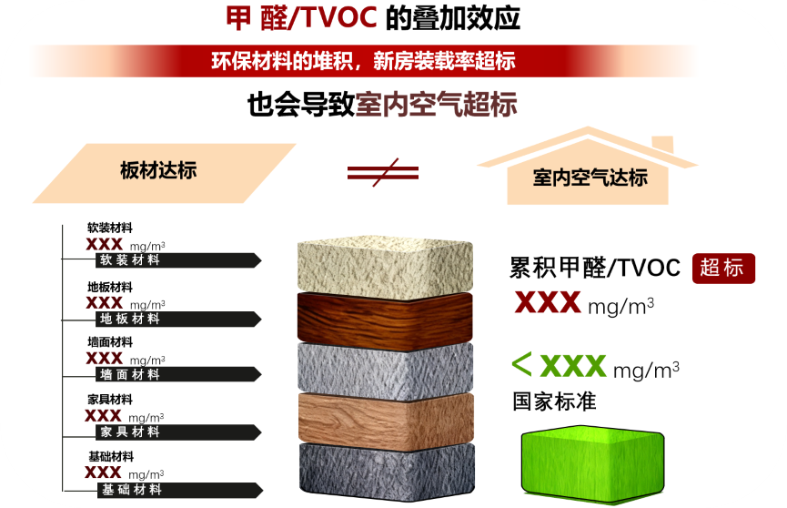 第三,要注意甲醛和TVOC的叠加效应。室内装修中的软装材料,以及装修过程中使用的胶水、涂料等,都有可能含有甲醛。即使单个产品达标,多种材料放在一起,也有可能导致室内空气甲醛超标。